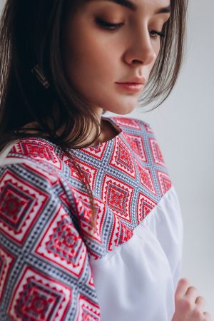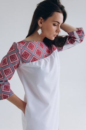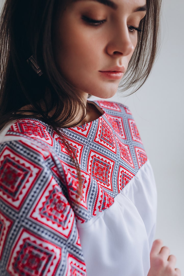 В платье Триполье гармонично переплелось древний ромбовидный орнамент с современным кроем.Мабуть наиболее популярной вышитой фигурой на одежде есть ромб. Его связывают с плодовитостью человека и земли. Основой расшифровки значение символа есть мужское и женское начало. В праукраинском понимании три угла ромба держит женщина (как три угла дома), а лишь четвертый — человек, который завершает целостность. Ромб (с точкой посередине) является символом засеянного поля, имело чрезвычайно большое значение для наших предков означало достаток и благополучие.