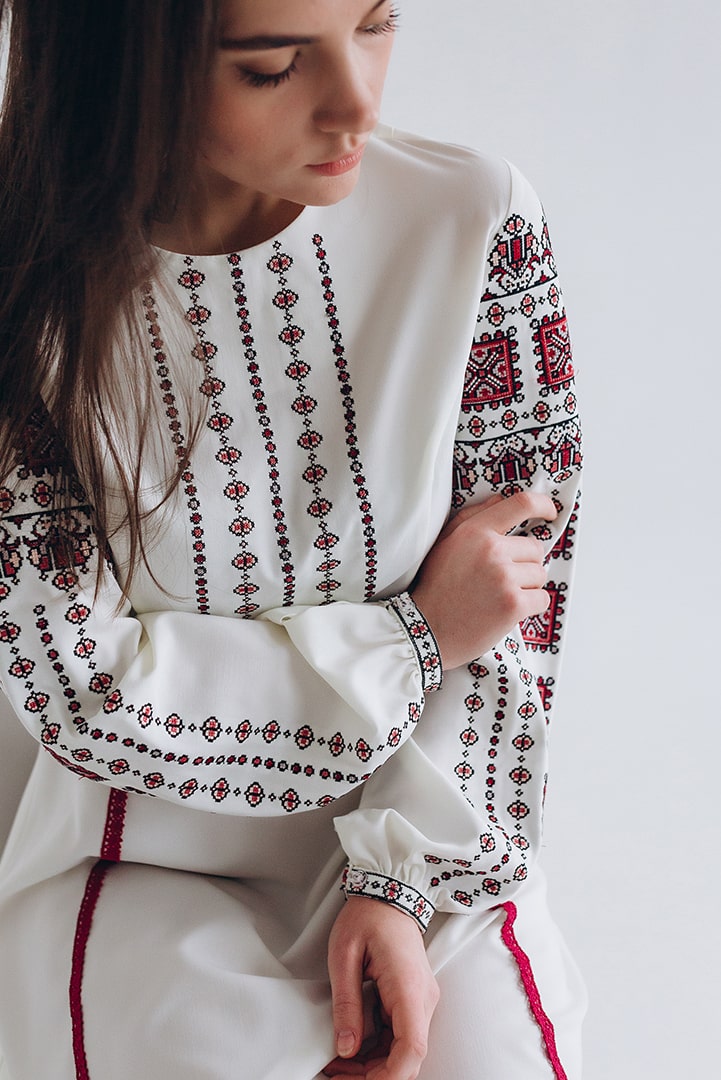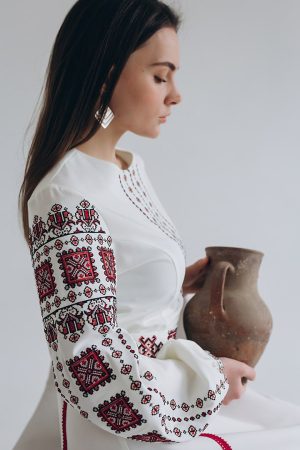 Сукня Античність оздоблна розкішною вишивкою “Квадрат”. Такий вибір орнаменту є невипадковим, адже квадрат в українській традиції є одним із символів землі. Оскільки українці з давніх-давен є хліборобами, тож не дивно, що саме квадрат, з його важливим для слов’ян “земним” значенням є таким поширеним у вишивці.