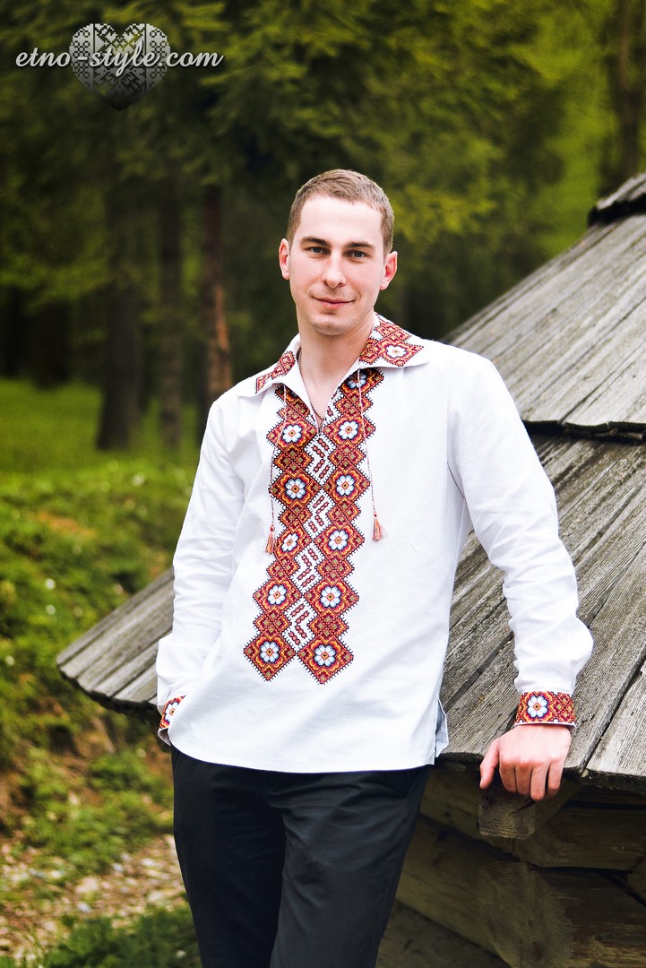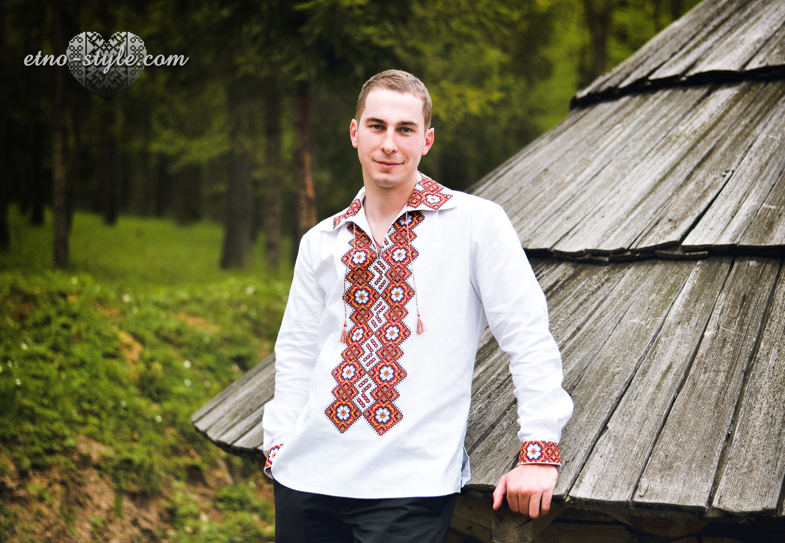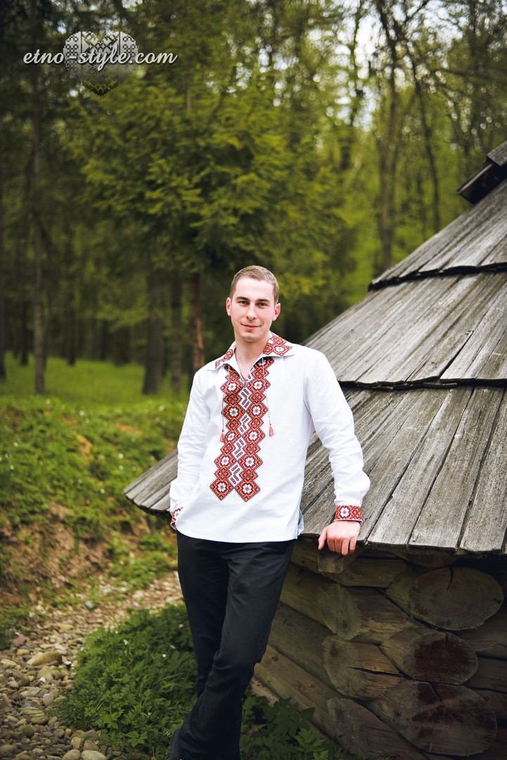 Яскрава неповторна чоловіча вишиванка з багряною вишивкою на білому бавовняному полотні. Колірна гама вишивки та тканина може бути змінена згідно з вашими побажаннями.