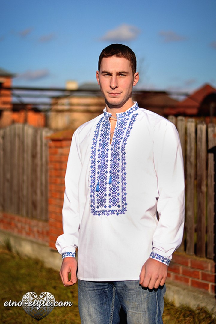 Елегантна чоловіча вишивана сорочка з орнаментом у синьо-блакитних тонах, що чудово дивиться на білосніжному тлі. Ніжна чоловіча сорочка додасть вашому образу вишуканості та неповторності. Особливо пасуватиме людям з блакитними очима.