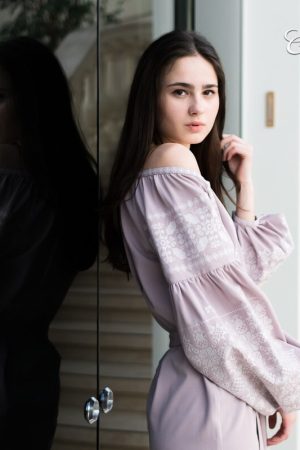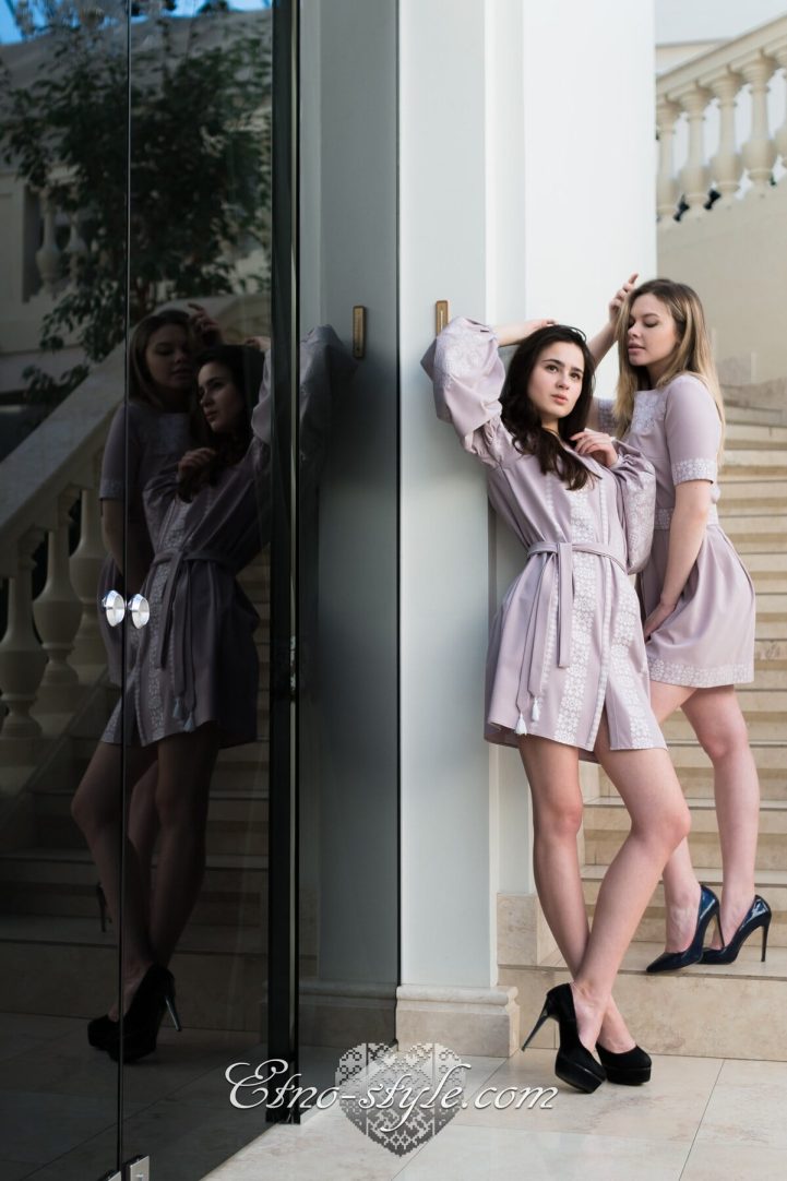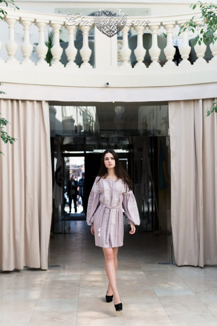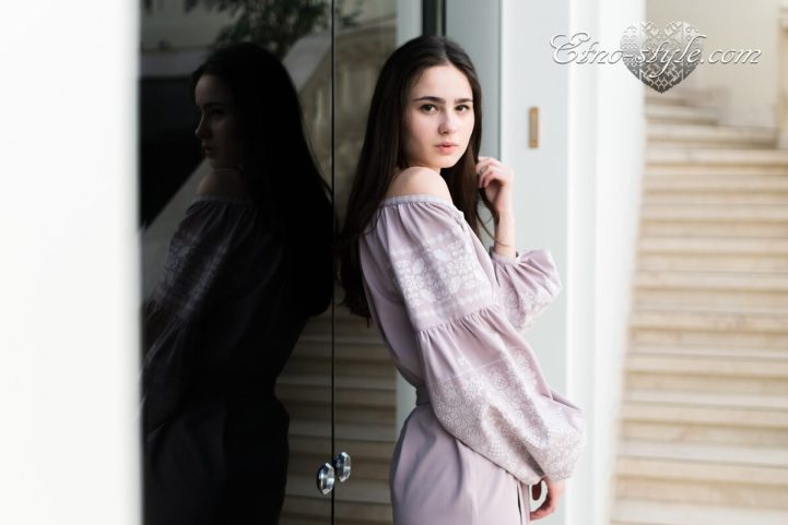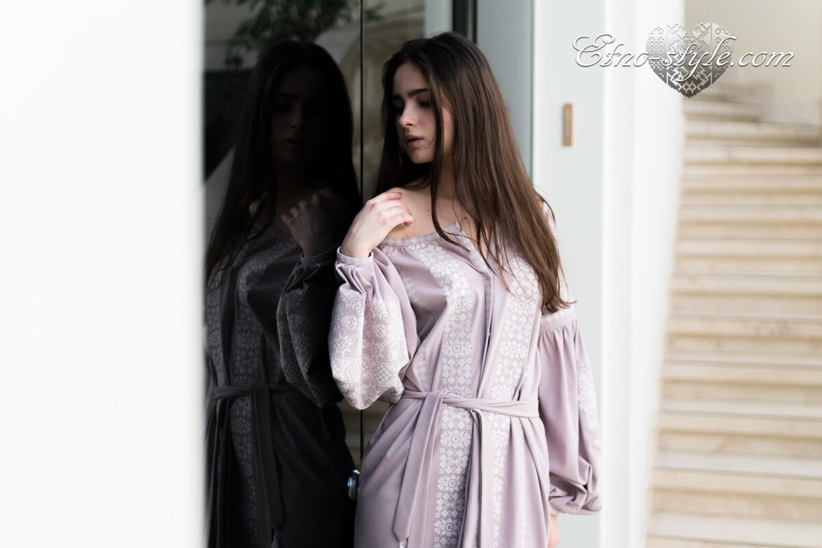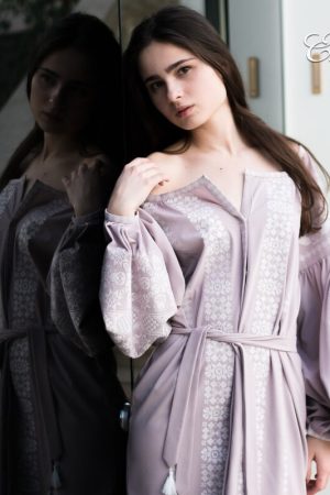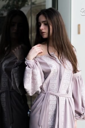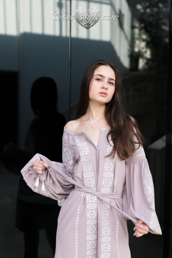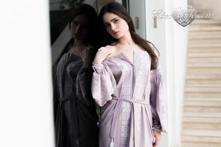 Тендітна та зваблива сукня, оздоблена ніжним орнаментом збагатить гардероб кожної елегантної леді. На фото використана високоякісна тканина кольору “пудра”. Завдяки широкому асортименту наявних тканин та ниток для вишивки, ми пропонуємо вам стати дизайнерами своєї сукні та обрати свої унікальні кольори вишивки та матеріал сукні. Для цього просто зателефонуйте нам та висловіть свої побажання.