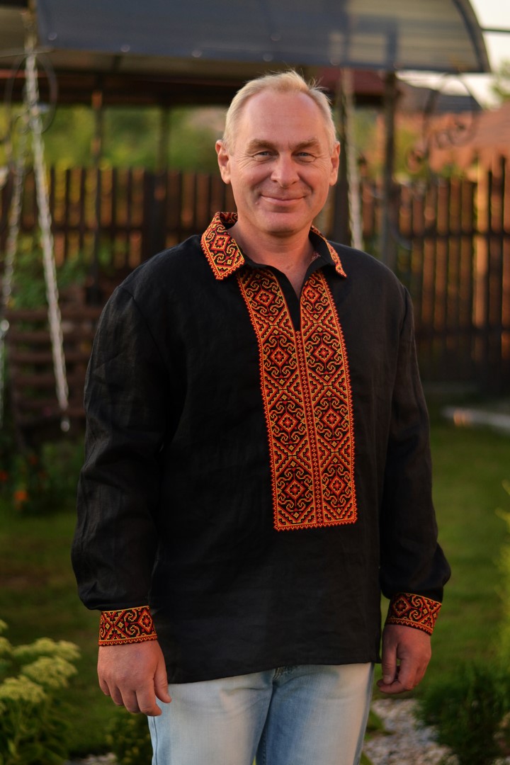 Чоловіча вишиванка зроблена з натурального, чорного білоруського льону. Жовто-багряні відтінки вдало поєднюються з чорним тлом матерії, завдяки чому сорочка виглядає вишукано та багато.