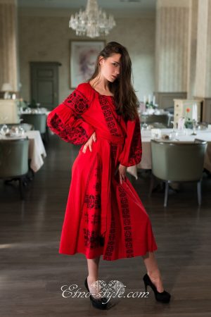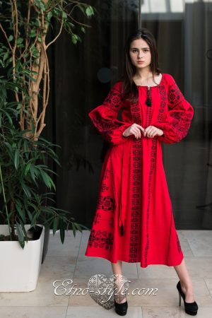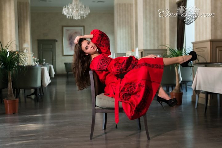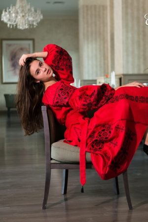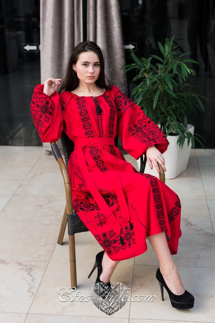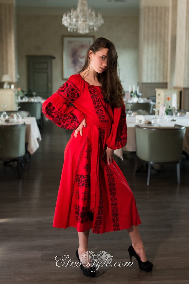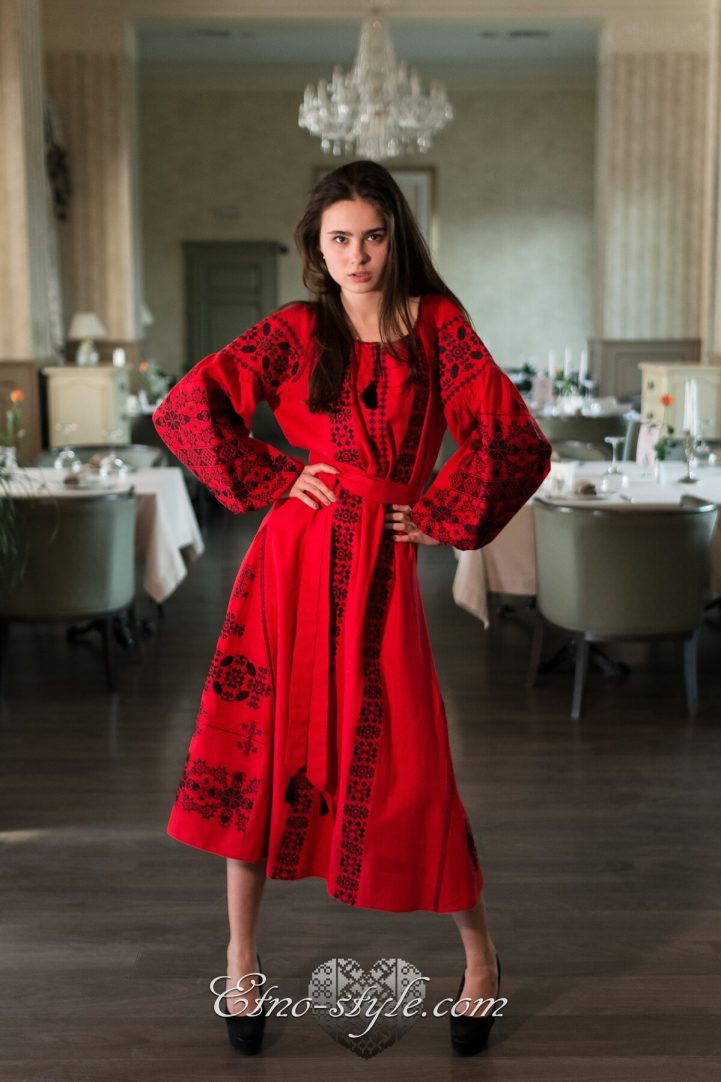 Розкішна та ефектна вишита сукня оздоблена багатим ексклюзивним орнаментом неодмінно стане улюбленим елементом Вашого гардеробу. Така сукня не залишить байдужими оточуючих і ви залишатиметесь в центрі уваги. На фото використаний високоякісний натуральний льон червоного кольору, оздоблений вишивкою чорними нитками. За вашими індивідуальними побажаннями тканина та кольори вишивки можуть бути змінені. Для цього тільки зателефонуйте нам, і ми охоче врахуємо всі ваші побажання.