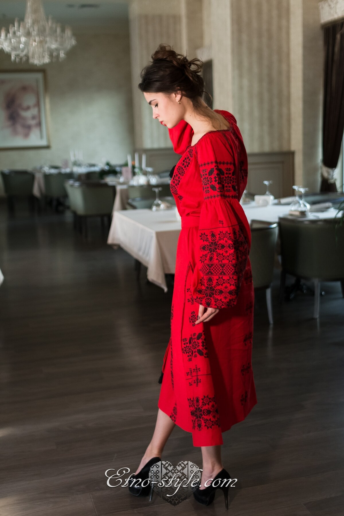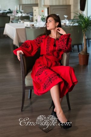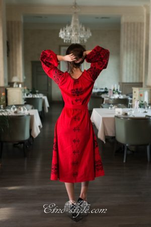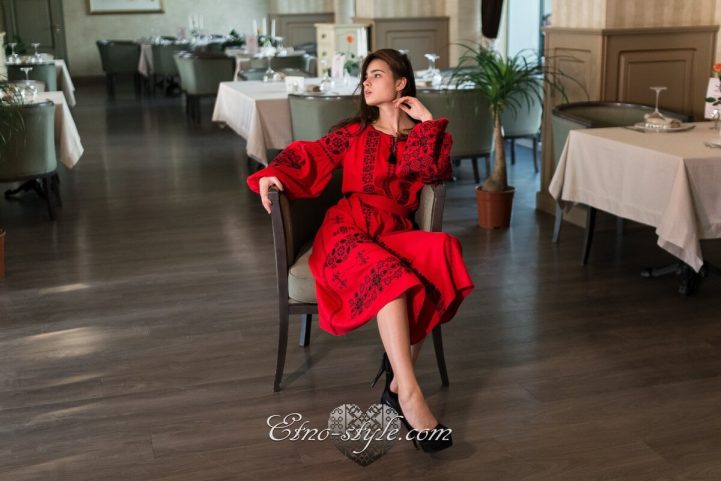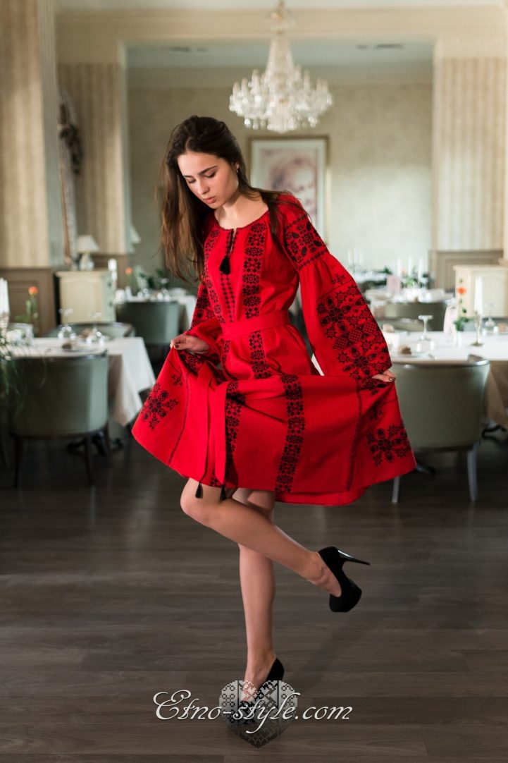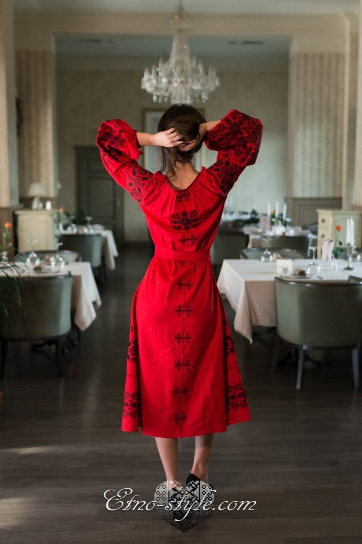 Розкішна та ефектна вишита сукня оздоблена багатим ексклюзивним орнаментом неодмінно стане улюбленим елементом Вашого гардеробу. Така сукня не залишить байдужими оточуючих і ви залишатиметесь в центрі уваги. На фото використаний високоякісний натуральний льон червоного кольору, оздоблений вишивкою чорними нитками. За вашими індивідуальними побажаннями тканина та кольори вишивки можуть бути змінені. Для цього тільки зателефонуйте нам, і ми охоче врахуємо всі ваші побажання.