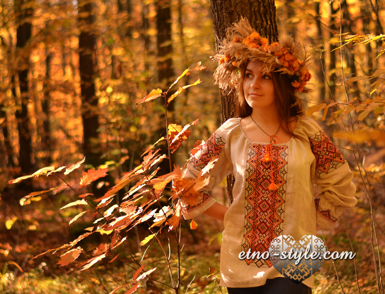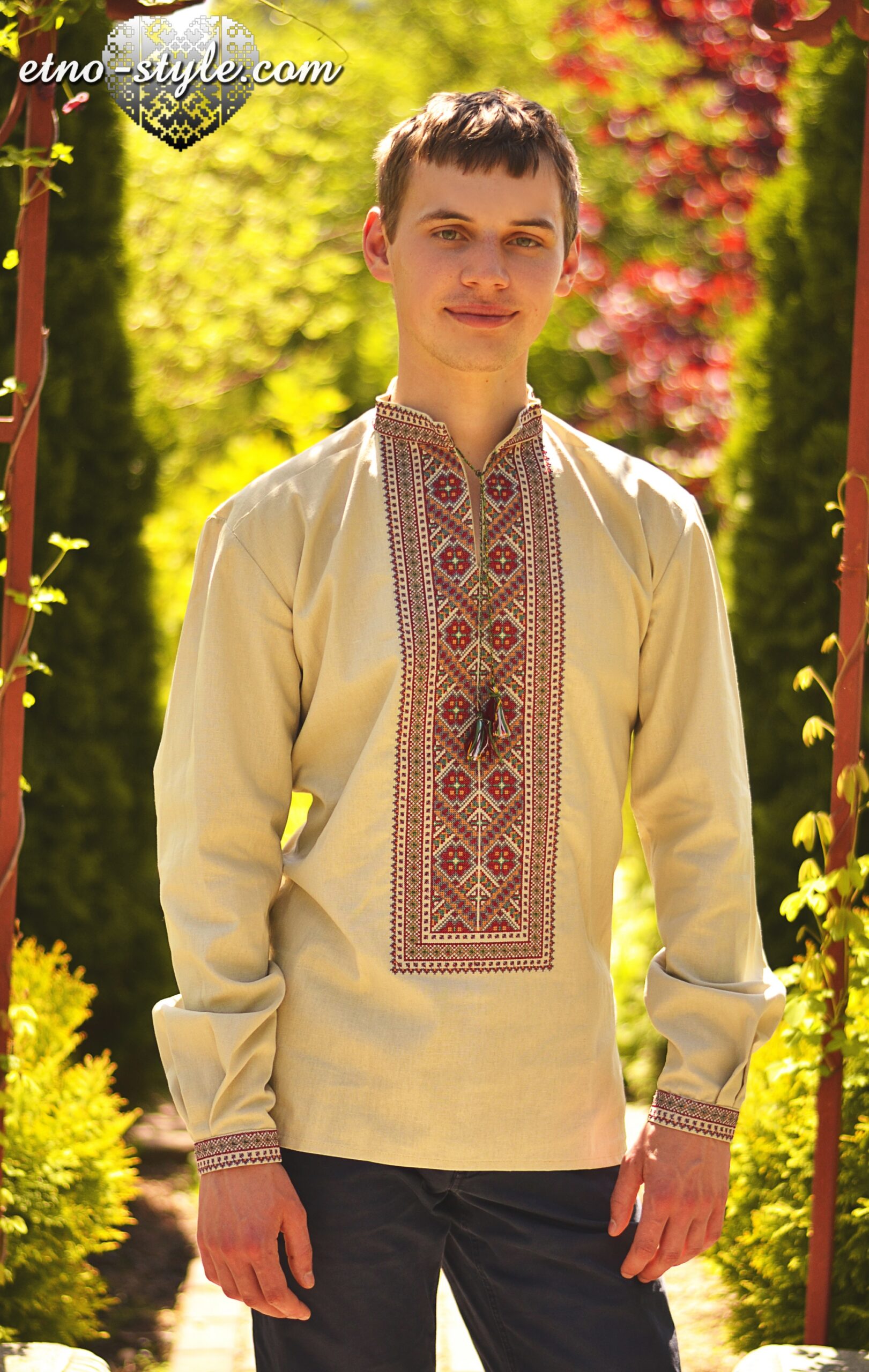 Чоловіча вишиванка з автентичним українським орнаментом підкреслить ваше шанобливе ставлення до українських традицій. Багряна колірна гама вишивки вдало поєднується з бежевим тлом натурального льону. Вишита стійка може бути замінена на комірець за бажанням.